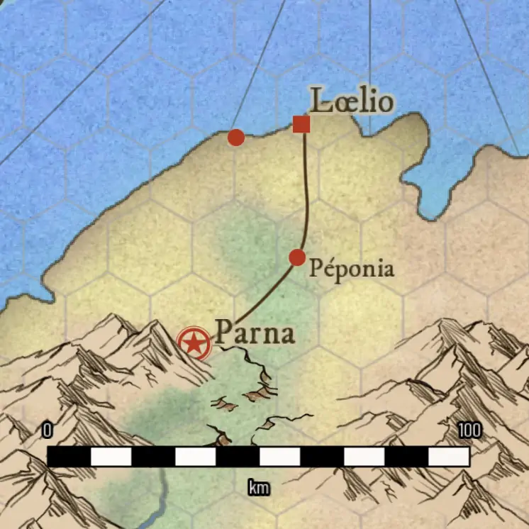 Péponia est un village laurien typique. Situé sur les terres de la famille Karras, à mi-chemin entre Loelio et Parna, le village compte environ 600 habitants.